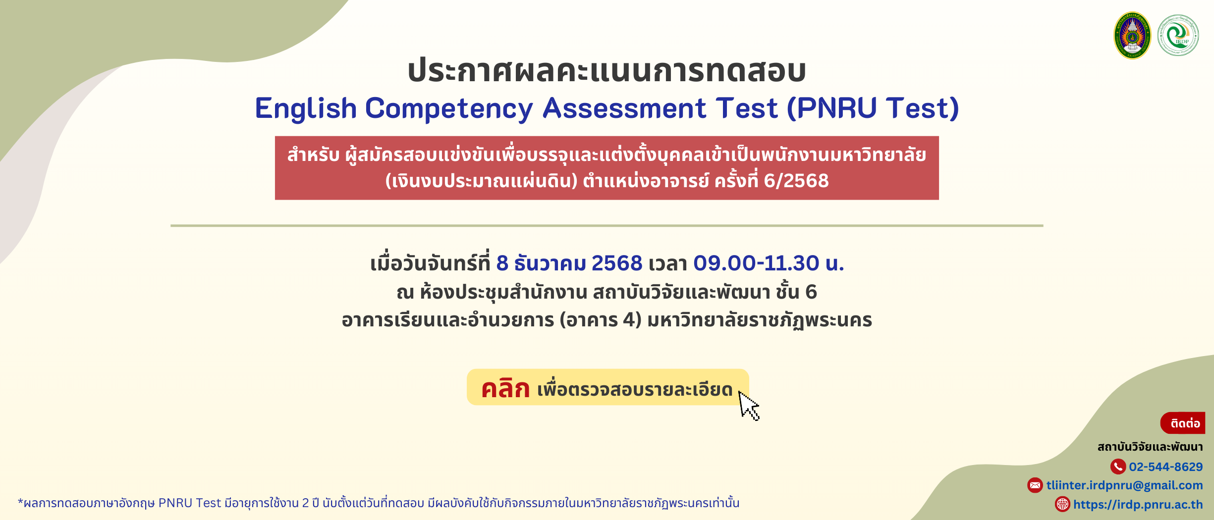 ประกาศผลคะแนนทดสอบวัดความสามารถทางภาษาอังกฤษ (PNRU TEST) สำหรับผู้สมัคร ตำแหน่งอาจารย์ ครั้งที่ 4/2568 และ 5/2568