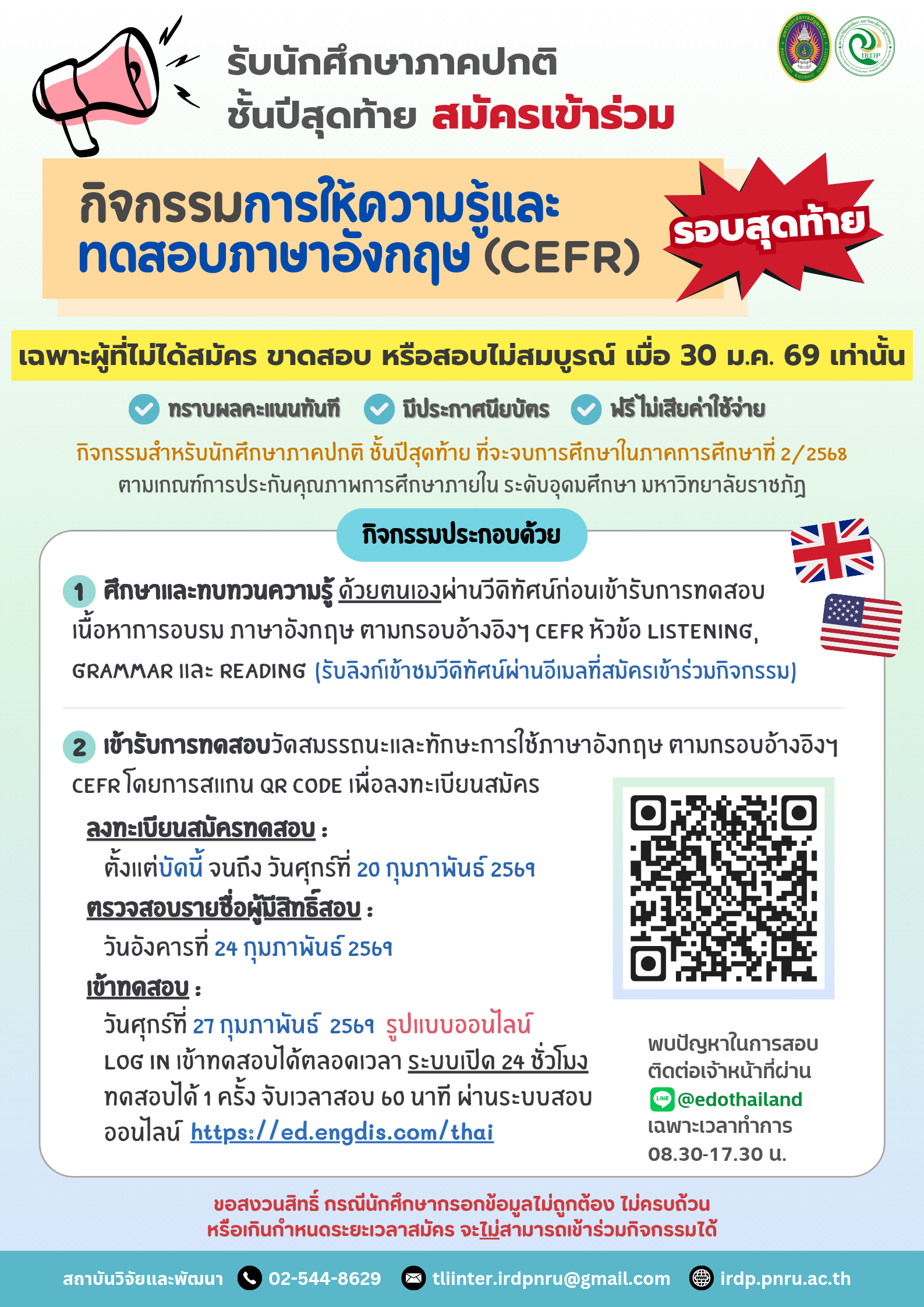 ลงทะเบียนเข้าร่วมกิจกรรมการให้ความรู้และทดสอบภาษาอังกฤษฯ (CEFR) สำหรับนักศึกษาชั้นปีสุดท้าย 2/2568 รอบสุดท้าย (สอบ 27 กุมภาพันธ์ 2569)